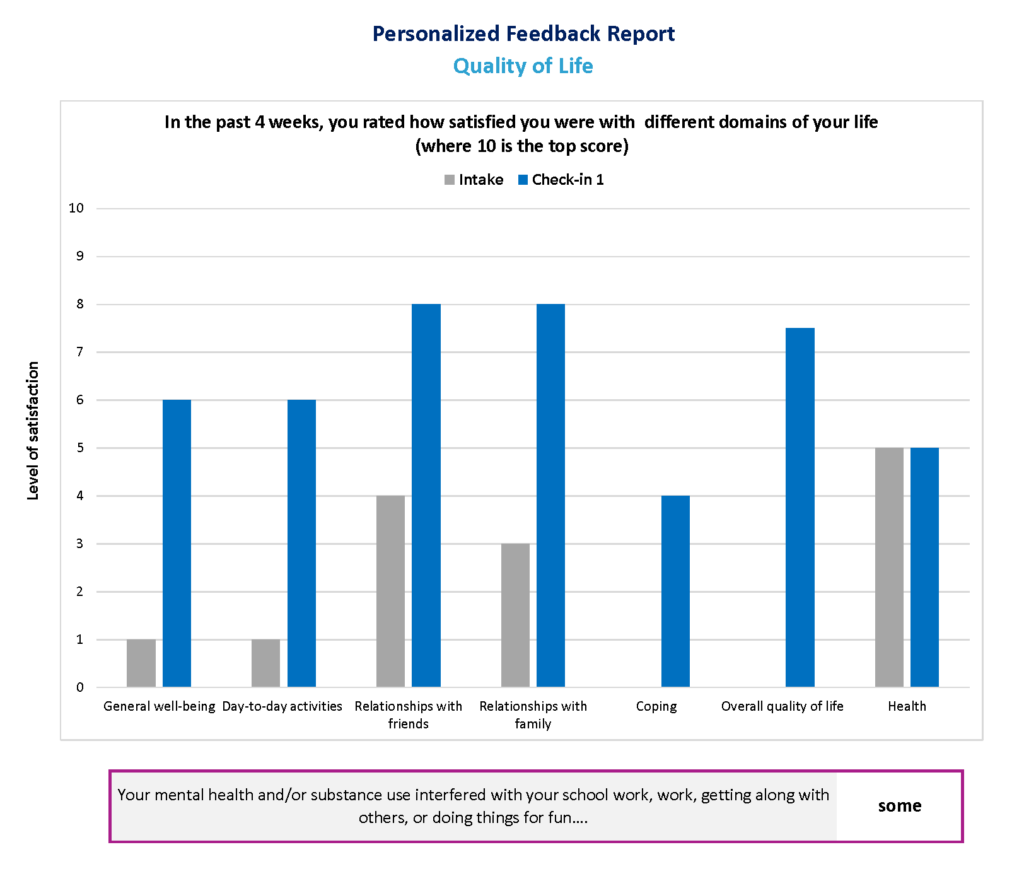 1) The data can be used to create a clinician feedback report that summarizes a single patient’s responses to the clinics key measures. This report can be used by the clinician to review a patients status and guide therapeutic planning and conversations